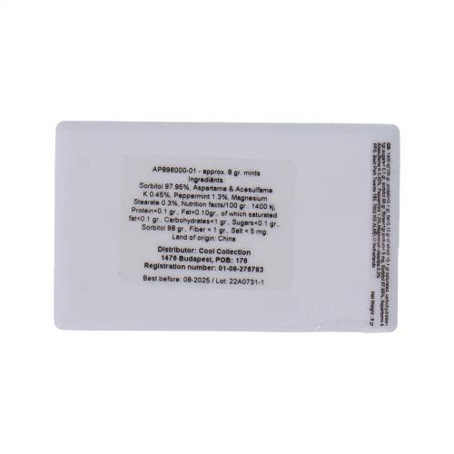 Card-shaped plastic mint box with approx. 8 g menthol candies.