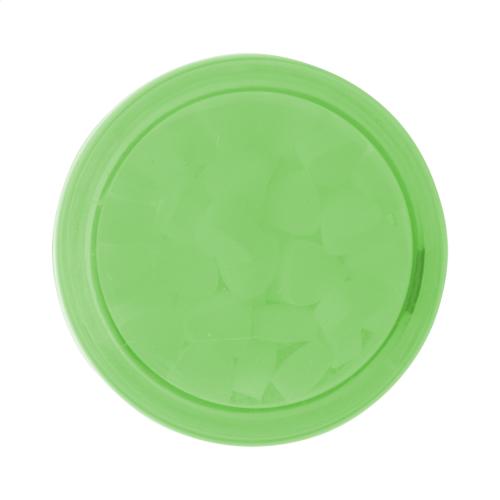 Round, transparent plastic mint jar with coloured screw lid. Containing approx. 12 grams of sugarfree menthol candies.