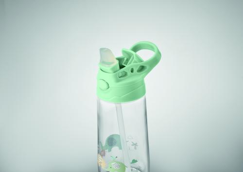 Kid's drink bottle in tritan with built in straw lid. Leak free. Capacity: 450 ml.