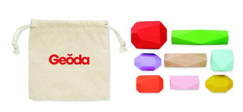 8 coloured wooden stacking rocks set in cotton drawcord pouch.