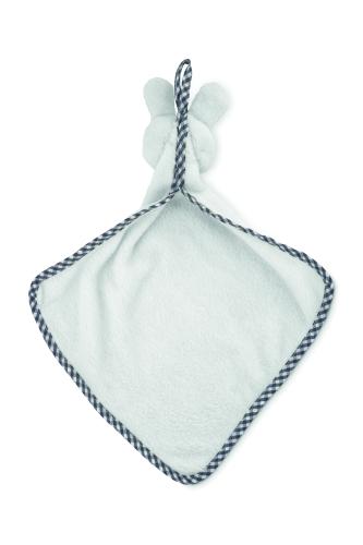 Plush baby towel in velvet polyester with rabbit design on the top. 180gr/m².