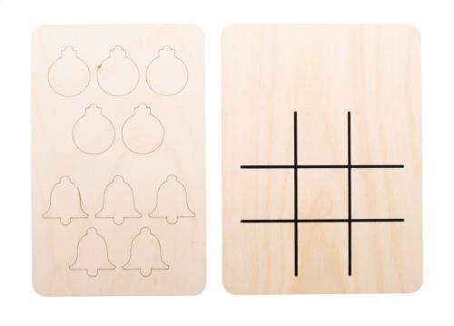 Christmas design tic-tac-toe game in birch plywood with 10 tokens and game board.