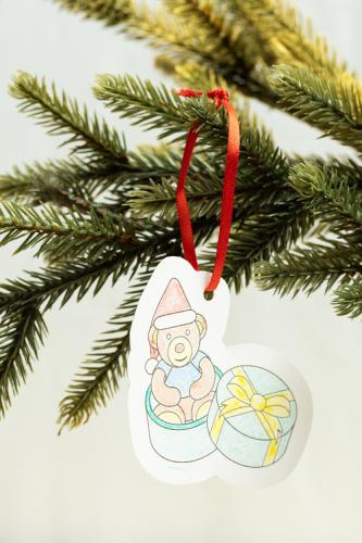 8 pc Christmas colouring set with paper ornaments cards, including 6 crayons and hanging ribbons. In red paper box.