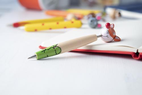 Wooden ballpoint pen with coloured barrel and animal figure. With blue refill.