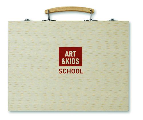 Artist's set in wooden box including 66 pieces (wax crayons, oil pastels, markers, coloured pencils, water colours, sharpener, glue, eraser, paint brush, ruler, and pencil).