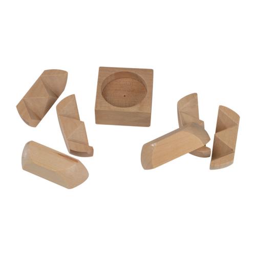 Puzzle skill game made of wood, carefully fit the 6 blocks in the holder together.