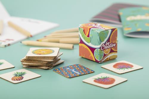 Paperboard memory game with thematic motives in custom paper box. With 24 tiles (40x40 mm). Price includes 12 different full colour print on front side of tiles, 1 full colour print on backside of all tiles and a full colour printed box. MOQ: 250 pcs.