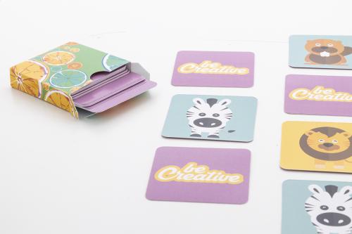 Paper memory game with thematic motives in custom paper box. With 24 tiles (55x55 mm). Price includes full colour print on backside of all tiles and a full colour printed box. MOQ: 100 pcs.