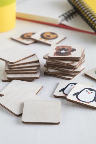 Laminated birch wood memory game with thematic motives. With 24 tiles (40x40 mm). Price includes 1 colour logo print on backside of all tiles. MOQ: 50 pcs.
