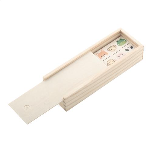 Wooden dominoes with thematic graphics, in wooden box. With 28 tiles.