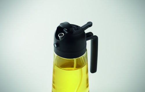 2-in-1 glass oil dispenser and sprayer with PP lid and PE straw. Capacity 450 ml.