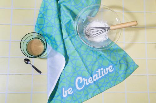 Woven twill kitchen towel with hanger and sublimation printed graphics on front side. 30% RPET and 70% cotton, 280 g/m². Price includes sublimation printing. MOQ: 25 pcs.