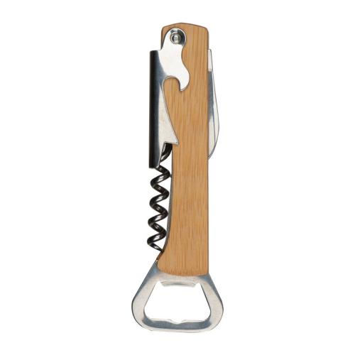 Metal and bamboo waiter's knife with bottle opener, corkscrew and foil cutter.