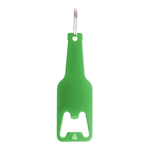 Bottle shaped recycled aluminium bottle opener with metal keyring.