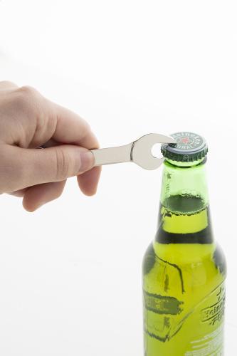 Wrench shaped, metal bottle opener keyring. In kraft paper box.
