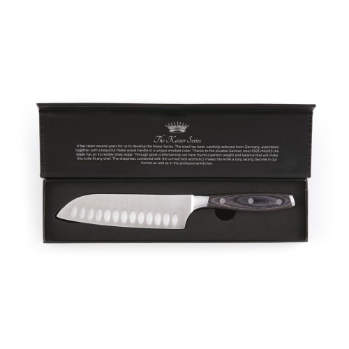 Santoku knife made of X50CrMoV15 German steel with a Pakkawood handle. The easy-grip handle and superb balance in the blade makes the knife comfortable and easy to work with. Size: 14 cm blade.