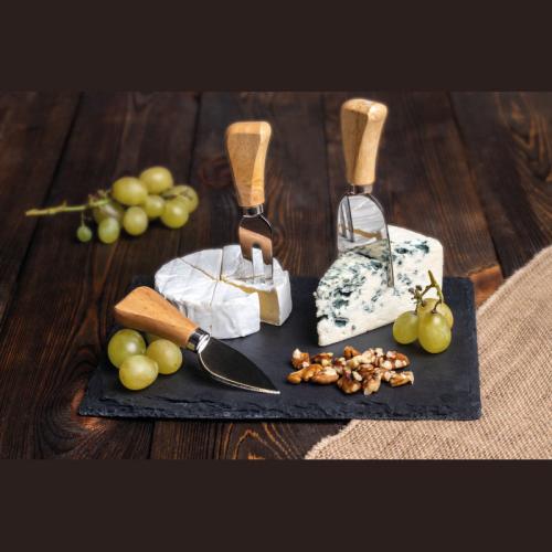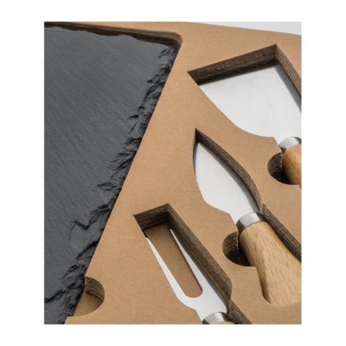 Cheese set in a sturdy cardboard gift box, with one slate cutting/presentation plate, one small and one flat cheese knife, and one cheese fork made of stainless steel.