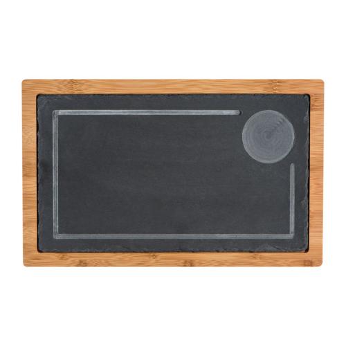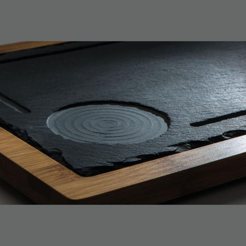 Bamboo serving board with a slate plate. There is a holder for drinks on the plate as well as a circulating drainage channel.