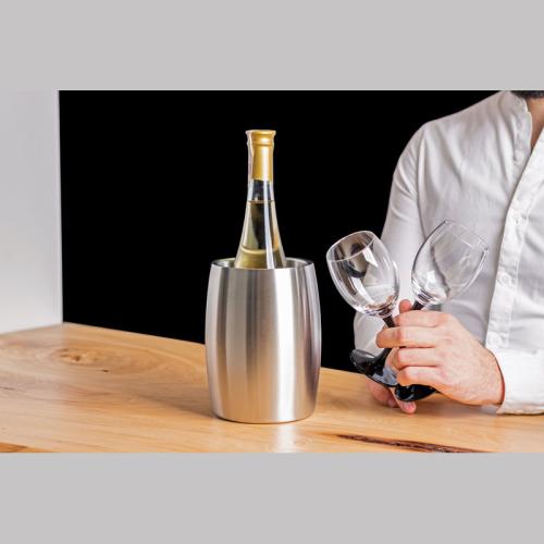 Wine cooler made of high-quality, double-walled stainless steel. Keeps cool for a long time without ice cubes and is appropriate for all popular bottle sizes.