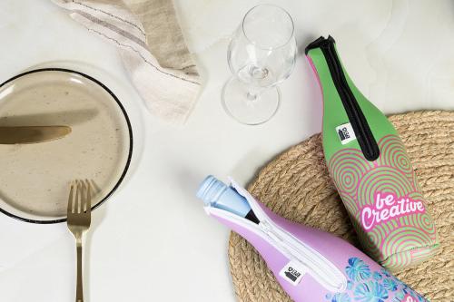 Custom made, zipped RPET neoprene cooler cover for wine or champagne bottle. With all over sublimation printed graphics. MOQ: 25 pcs.