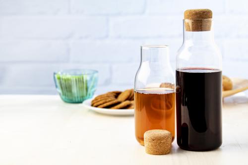Borosilicate glass water carafe with cork lid, 1000 ml. Suitable for both cold and hot drinks, it can be also used as a decanter bottle.
