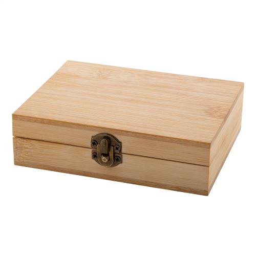 Reusable stone ice cube set in bamboo box. Includes 9 stone ice cubes, a cotton storage pouch and stainless steel tongs.