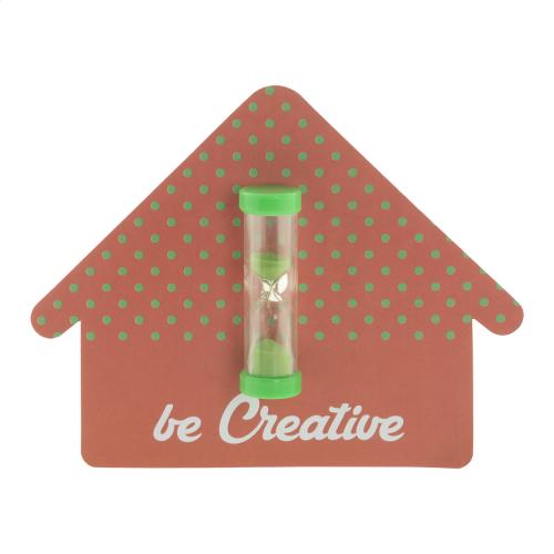 Plastic, 3 minutes sand timer with matching colour sand and suction cup holder. Customise it with paper insert!