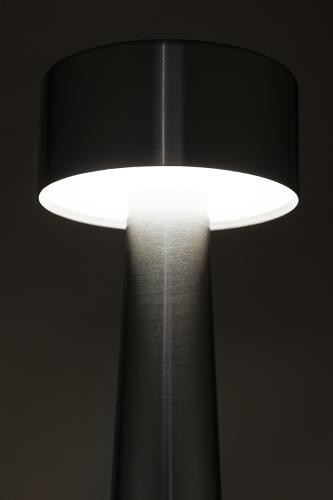 Stainless steel table lamp with 24 LEDs, adjustable brightness and 800 mAh USB rechargeable battery. With warm, natural and cool light modes. Including USB charger cable.