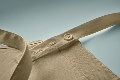 Adjustable bib apron with 1 large front pocket with 2 compartments in 240 gr/m² organic cotton. With adjustable button on the neck strap.