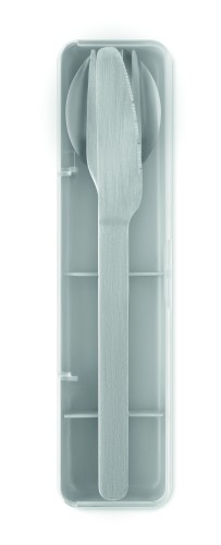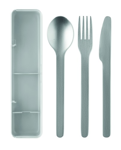 Stainless steel cutlery set with PP case. This set includes a fork, knife and spoon.