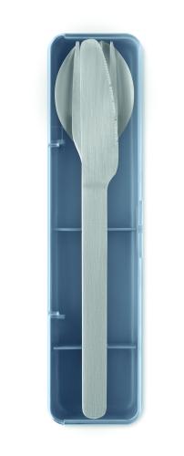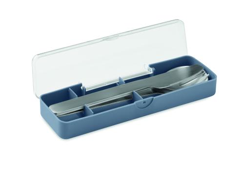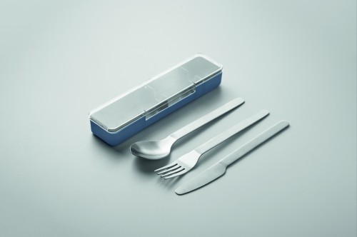 Stainless steel cutlery set with PP case. This set includes a fork, knife and spoon.