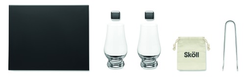 Set of 2 sniffer tasting glasses (200ml) for whisky or other liquors, 2 reusable stainless steel ice cubes, tongs and ice cube storage cotton pouch. Presented in gift box.