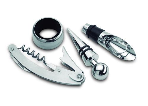 Wine set including bottle opener, stopper, pourer and anti-drip ring presented in tin box.