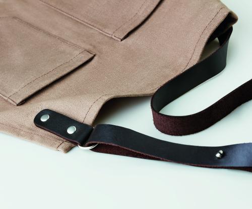 Apron in waxed canvas with leather details, adjustable strap with 2 chest pockets and 1 large low level pocket. 12oz Waxed Canvas.