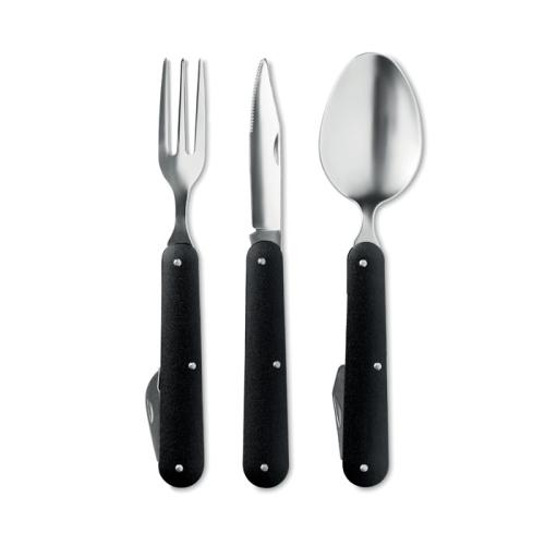 Camping cutlery set in stainless steel with aluminium handle. Combination spoon, fork and knife supplied in black pouch.