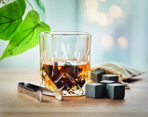 Luxury glass set in bamboo gift box for whiskey, gin, mojito or other drinks. Includes 2 glasses (300ml), 8 reusable stone ice cubes with storage cotton pouch and tongs. Bamboo is anatural product, there may be slight variations in colour and size per item,which can affect the final decoration outcome.
