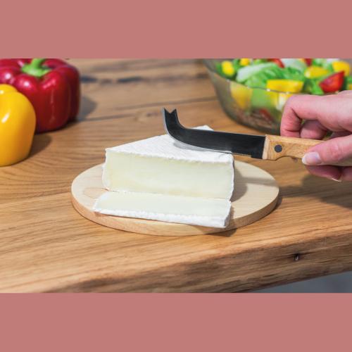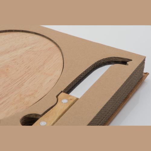 Cheese set in a sturdy cardboard gift box, includes a round wooden board and a cheese knife made of stainless steel.