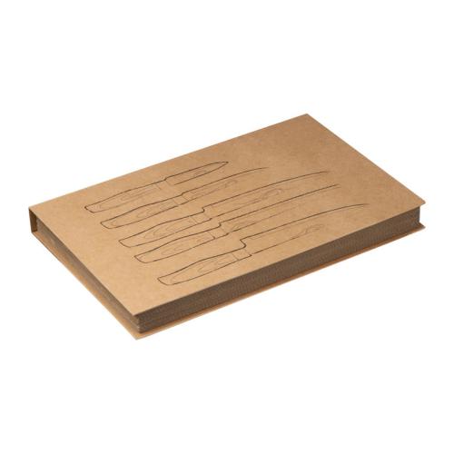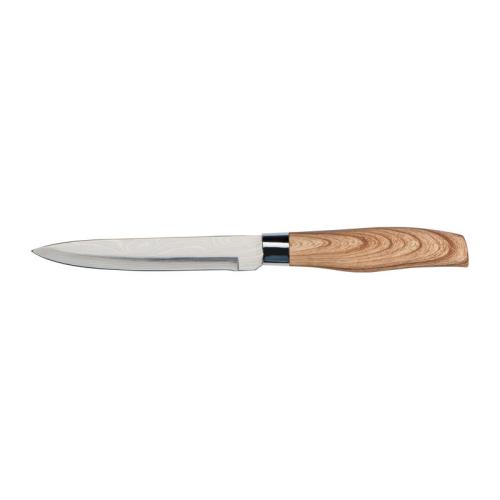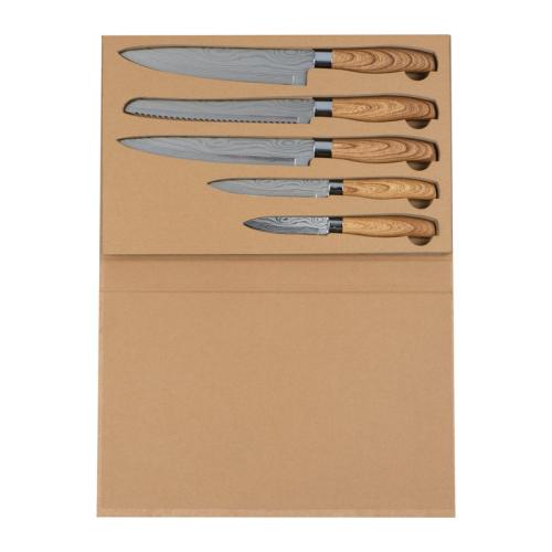 5-piece knife set. The knives in different sizes have a non-slip wood-looking handle and stainless steel cutting edge.