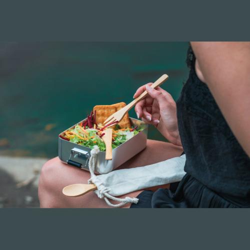 Bamboo cutlery, consisting of a fork, a knife and a spoon in a cotton bag. Suitable for camping or other outdoor activities.