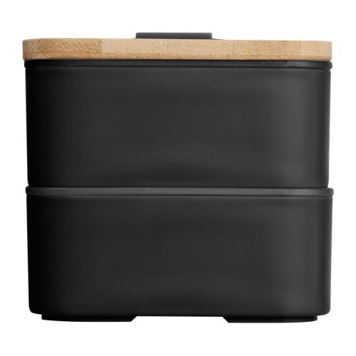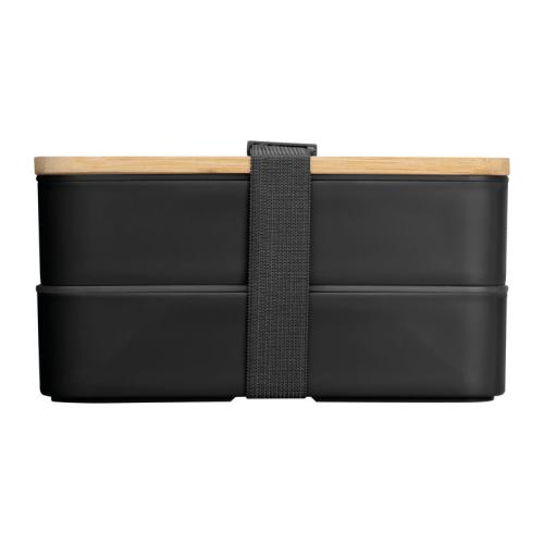 Two-tier lunch box with two separate compartments (both with their own lid), bamboo lid, a separator, knife, fork and a rubber band to close.