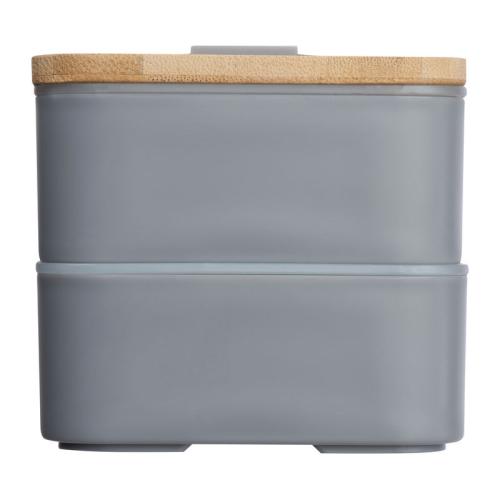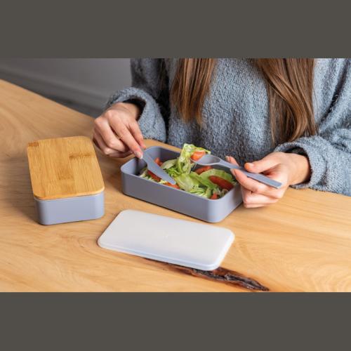 Two-tier lunch box with two separate compartments (both with their own lid), bamboo lid, a separator, knife, fork and a rubber band to close.