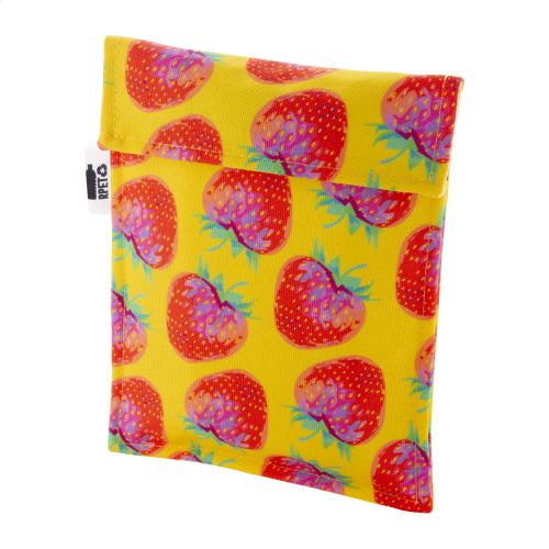 Custom made, reusable rolltop snack bag in 600D RPET polyester with durable waterproof lining and velcro closure. Ideal for wrapping snacks or a sandwich. With all over sublimation printed graphics. MOQ: 25 pcs.