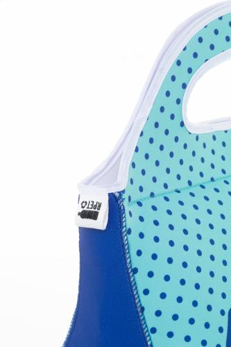 Custom made, RPET neoprene lunch bag with zipped compartment and handles. With all over sublimation printed graphics and distinctive RPET label. MOQ: 25 pcs.