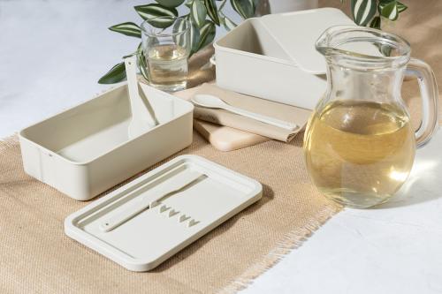 Lunch box in PP plastic with cutlery set (fork, spoon and knife), buckle closure and 2 compartments (1000 ml & 800ml). Stackable design for compact storage.