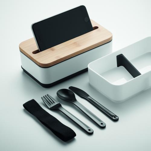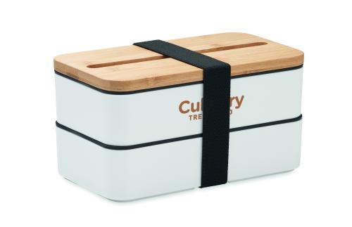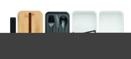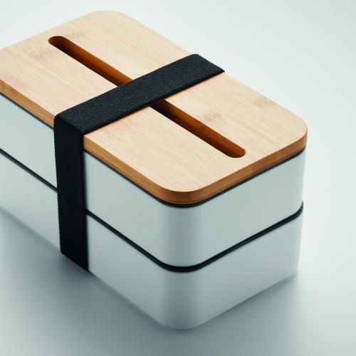 PP two-tier lunch box with removable divider and 3 cutlery utensils with attachable polyester band with bamboo lid. The lid has a phone stand functionality. Capacity: 400 ml (2x). Bamboo is a natural product, there may be slight variations in colour and size per item, which can affect the final decoration outcome.