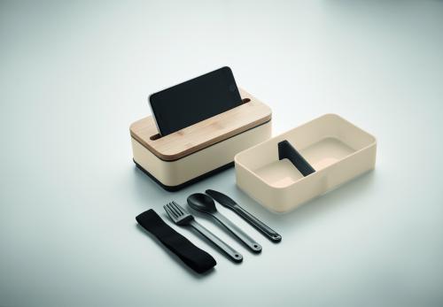 PP two-tier lunch box with removable divider and 3 cutlery utensils with attachable polyester band with bamboo lid. The lid has a phone stand functionality. Capacity: 400 ml (2x). Bamboo is a natural product, there may be slight variations in colour and size per item, which can affect the final decoration outcome.