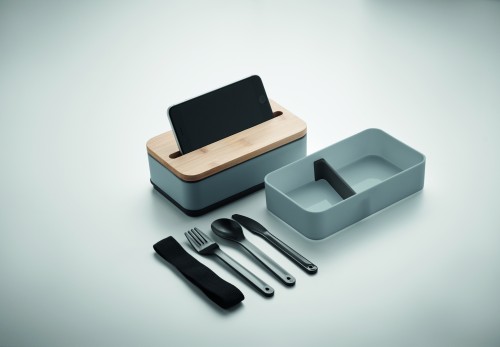 PP two-tier lunch box with removable divider and 3 cutlery utensils with attachable polyester band with bamboo lid. The lid has a phone stand functionality. Capacity: 400 ml (2x). Bamboo is a natural product, there may be slight variations in colour and size per item, which can affect the final decoration outcome.
