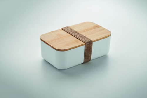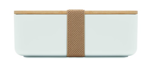 100% PLA corn lunch box with bamboo lid and RPET elastic band closure. Capacity : 1000 ml.