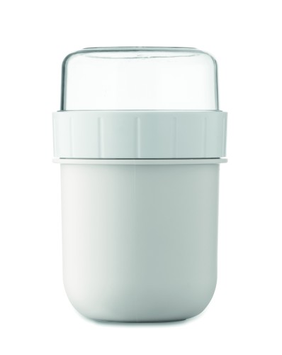 Breakfast or brunch on the go cup in PP and PS lid container. Consists of 2 individual containers to keep ingredients separate. Capacity: 450 ml and 160 ml. Leak-free.