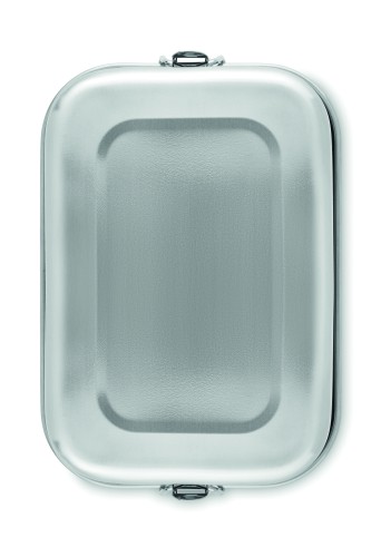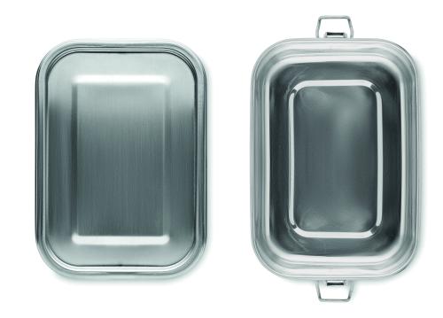 Recycled stainless steel (90 % recycled stainless steel and 10% stainless steel) lunch box with secure side buckles and round corners. Capacity: 750ml.